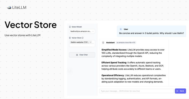 LiteLLM integrates with vector stores, allowing your models to access your organization's data for more accurate and contextually relevant responses.